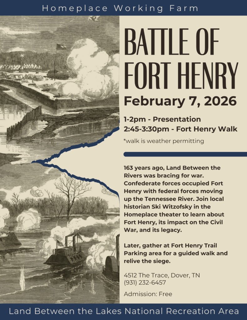 163 years ago, Land Between the Rivers was bracing for war. Confederate forces occupied Fort Henry with federal forces moving up the Tennessee River. Join local historian Ski Witzofsky in the Homeplace theater to learn about Fort Henry, its impact on the Civil War, and its legacy. Later, gather at Fort Henry Trail Parking area for a guided walk and relive the siege.