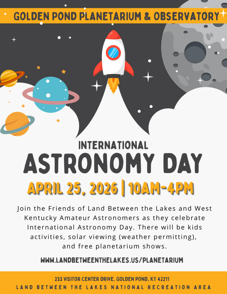 Join the Friends of Land Between the Lakes and West Kentucky Amateur Astronomers as they celebrate International Astronomy Day. There will be kids activities, solar viewing and free planetarium shows. More to come!